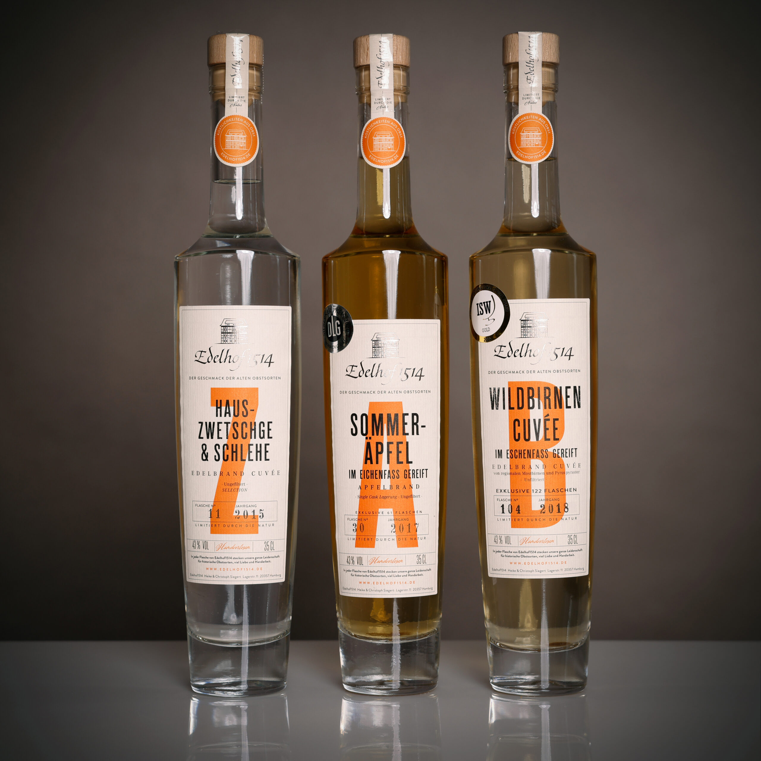 1x Edelbrandcuvée aus der Wildbirne (Pyrus pyraster) und regionalen Mostbirnen- und Tafelbirnensorten, im Eschenfass 12 Monate gereift, “Single Cask”, Jahrgang 2018, unfiltriert, numerierte und limitierte Auflage von 122 Flaschen. 43 %VOL, 0,35l Wir haben unsere Wildbirnencuvée über ein Jahr im Felsenkeller des Edelhofes gelagert. Das intensive Aroma der verschiedenen Birnensorten hat sich unter dem harmonisierenden und mikrooxidativen Einfluss des Eschenfasses zu einem komplexen würzigen Destillat entwickelt. GOLD bei den International Spirit Awards 2024.„…Unsere strengen Richtlinien für die Medaillen-Vergabe … hat Ihre Spirituose mit Bravour gemeistert: GOLD für die Wildbirnen Cuvée im Eschenfass gereift, unfiltriert. Das Bukett sehr typisch (6,6) und rein (6,0) im Geschmack sehr aromatisch (6,6) ein ausbalancierter Gesamteindruck (5,4) und intensives Finish (5,4).“